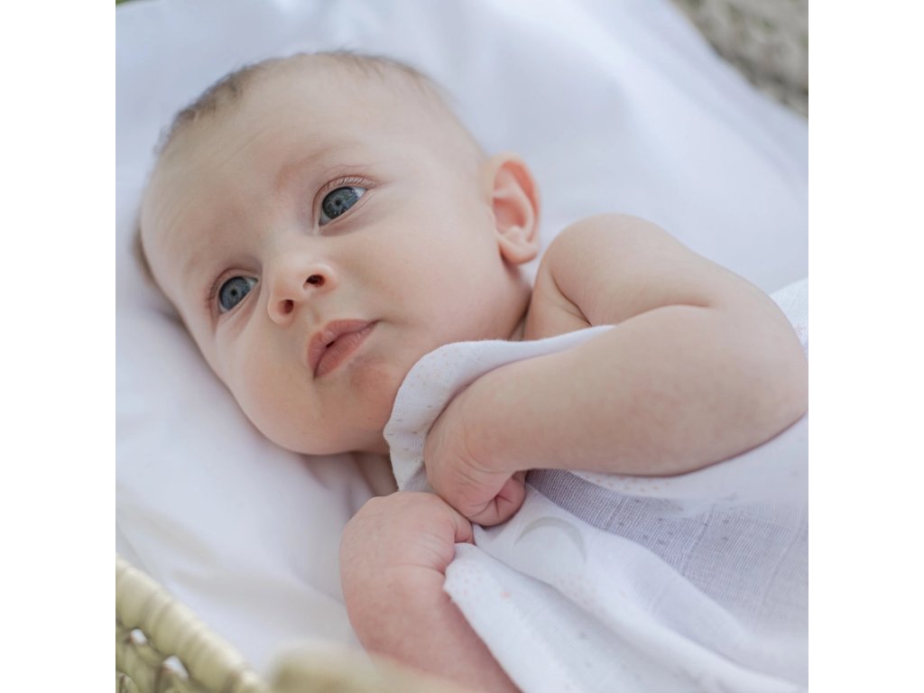 Deka má univerzálnu veľkosť 70×70 cm, takže ju môžete použiť aj ako plienku, zavinovačku či jemnú podložku. Organická bavlna je šetrná k citlivej pokožke bábätka a v rohu má praktické pútko na zavesenie alebo uchytenie cumlíka.